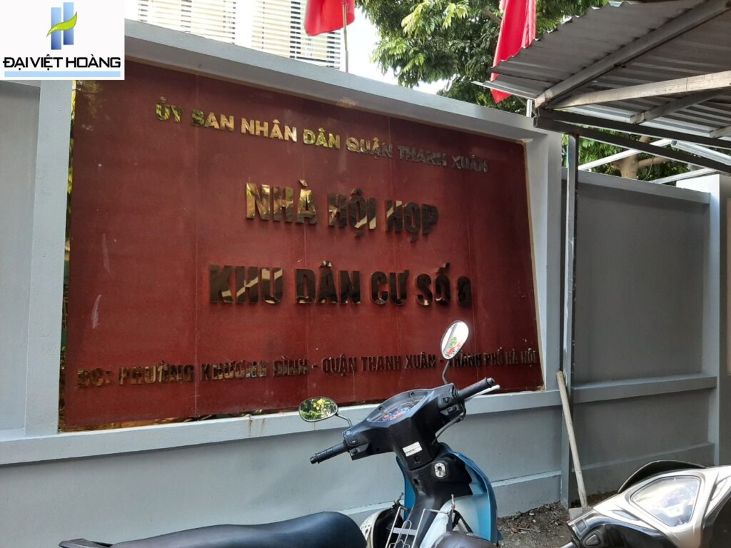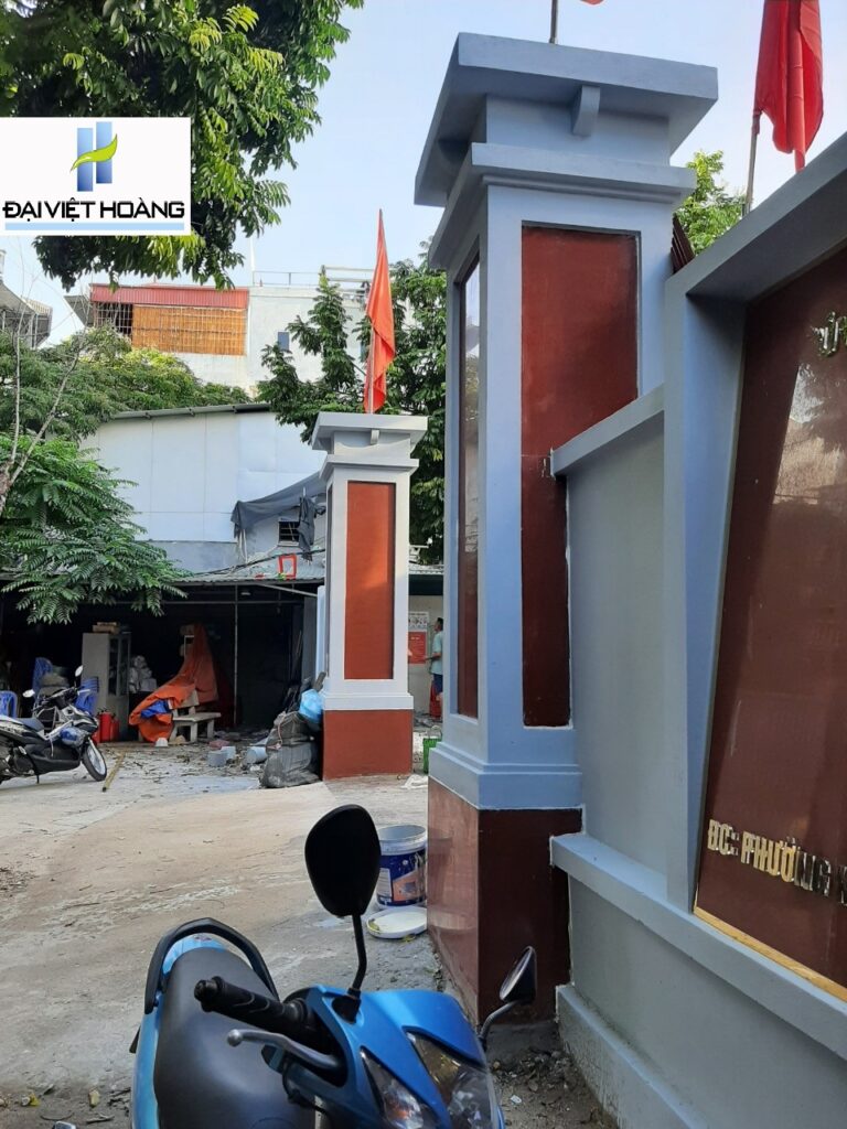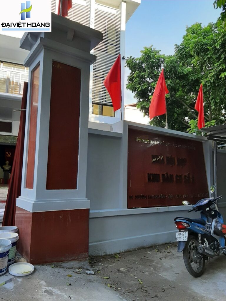 Ốp biển + cột cổng bằng đá Đỏ Bã Trầu công trình Nhà văn hóa Tổ 8, phố Khương Hạ, Thanh Xuân, Hà Nội