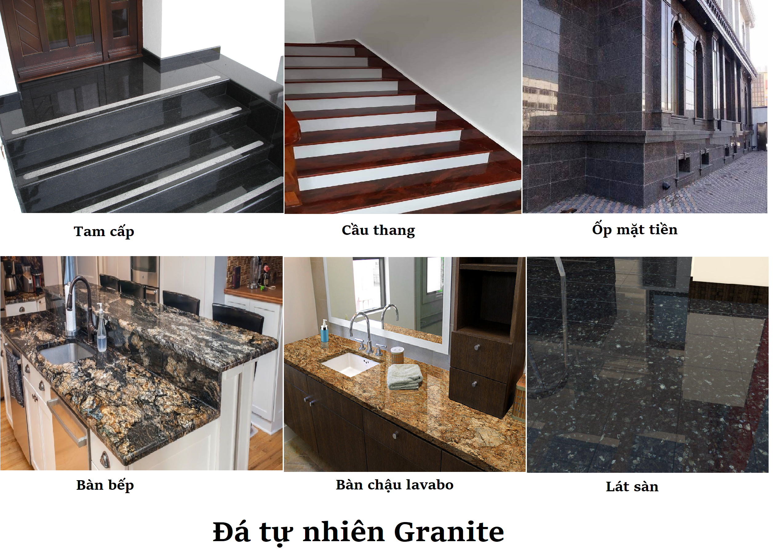 _ Đá  Granite được ứng dụng trong hầu hết các hạng mục: bàn bếp, bàn chậu lavabo đặc biệt các hạng mục thường xuyên chịu tác động ngoại lựa và ảnh hưởng của thời tiết: cầu thang, ốp mặt tiền, tam cấp…