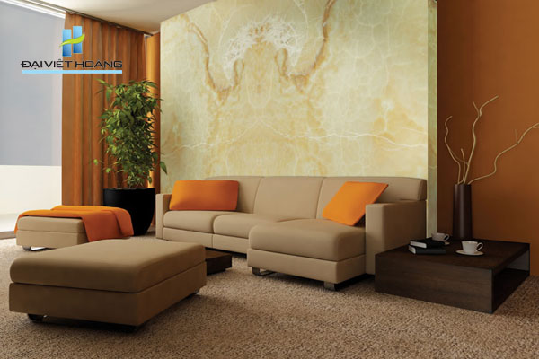 Một mẫu đá marble lớn được ốp ngay giữa phòng khách với các đường vân xuyên suốt, sống động làm gia tăng vẻ đẹp cho không gian phòng khách.